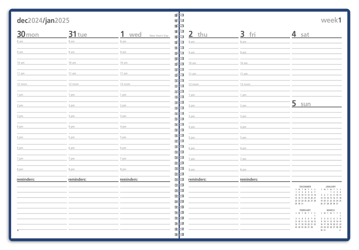 Includes both monthly and weekly dategrids. Each monthly dategrid is followed by weekly grids for the corresponding month. The SFI® label means that materials used for this product have been responsibly sourced.